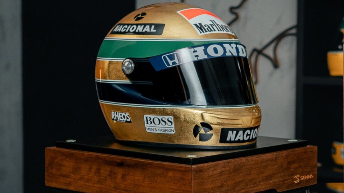 Capacete folheado a ouro em homenagem a Ayrton Senna vira item de coleção