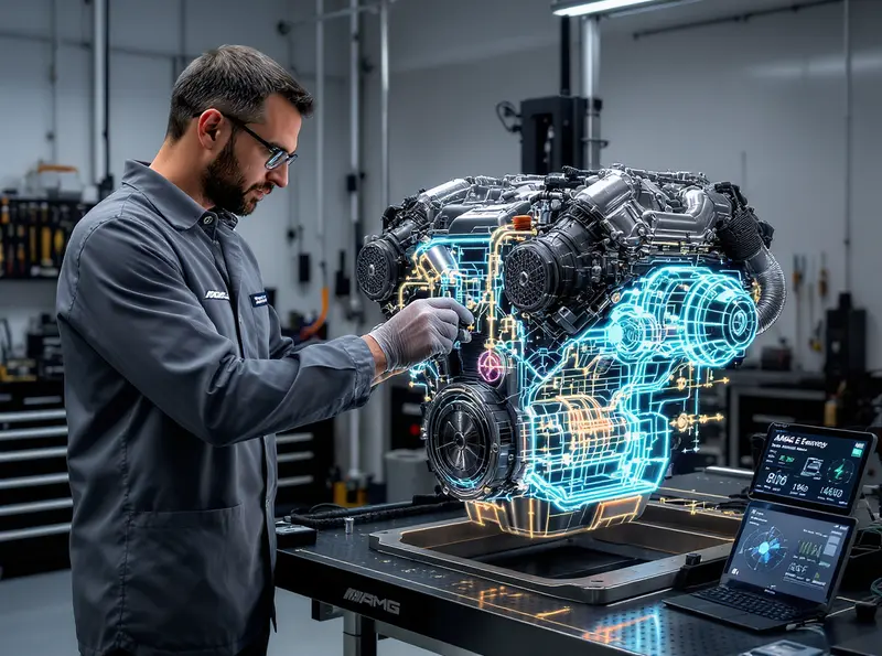 Engenheiro examina o inovador motor V8 híbrido da Mercedes-AMG em laboratório de P&D.