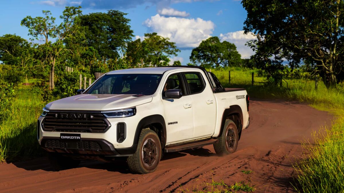O design da Ram Dakota 2026 diferencia-se da Fiat Titano com identidade própria na dianteira refinada e premium, rodas aro 18, frisos cromados, emblemas nas portas e lanternas reestilizadas na traseira. Não há opcionais; cores metálicas e perolizadas custam R$ 2 mil extras.