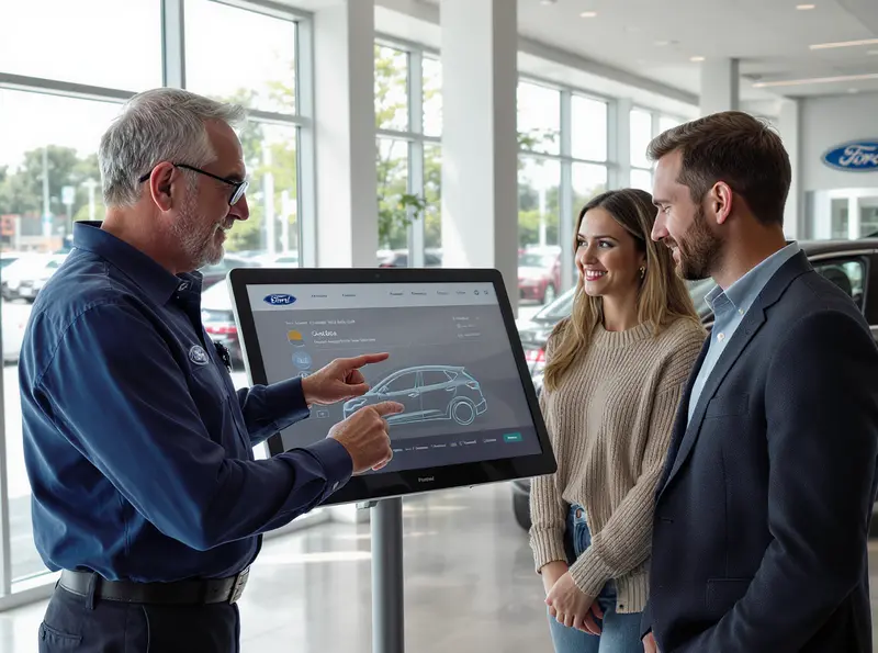 Um vendedor da Ford mostra um carro elétrico compacto em uma tela para um casal em uma concessionária.