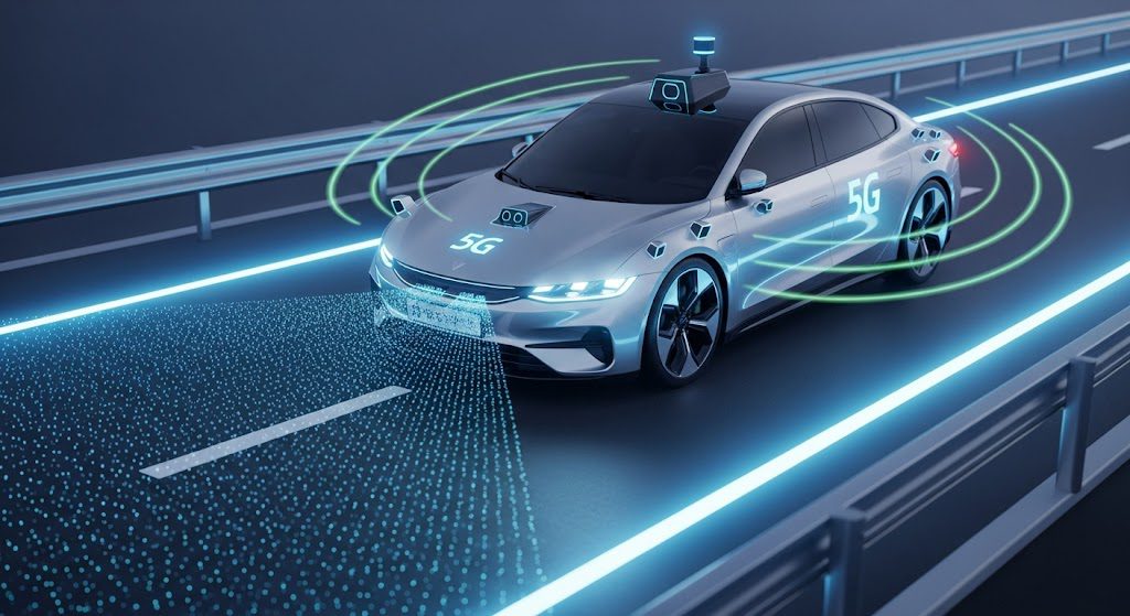 Carro autônomo em via inteligente, simbolizando o avanço da segurança e tecnologia em 2025 com conectividade 5G. Imagem gerada por IA
