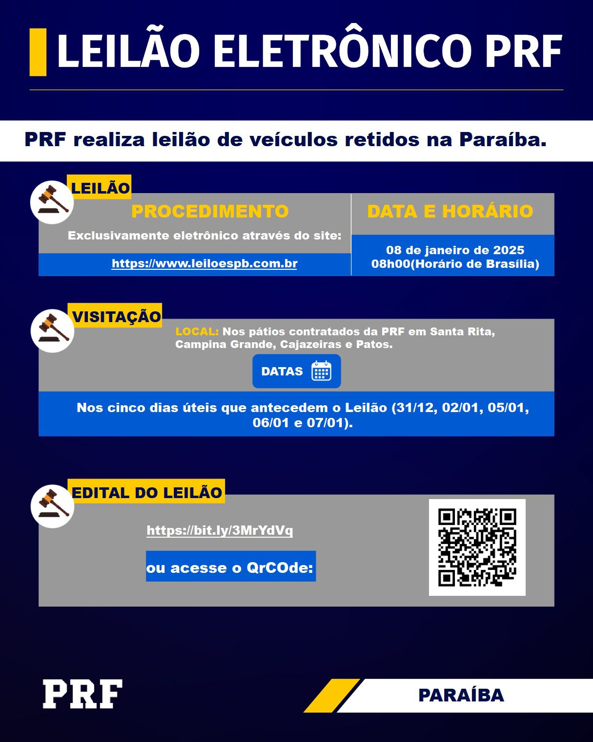 A Polícia Rodoviária Federal (PRF) da Paraíba realizará o primeiro leilão de veículos retidos de 2026. Serão leiloados 834 veículos (distribuídos em 377 lotes) nas classificações CONSERVADO, APROVEITÁVEL e APROVEITÁVEL C/ MOTOR INSERVÍVEL.